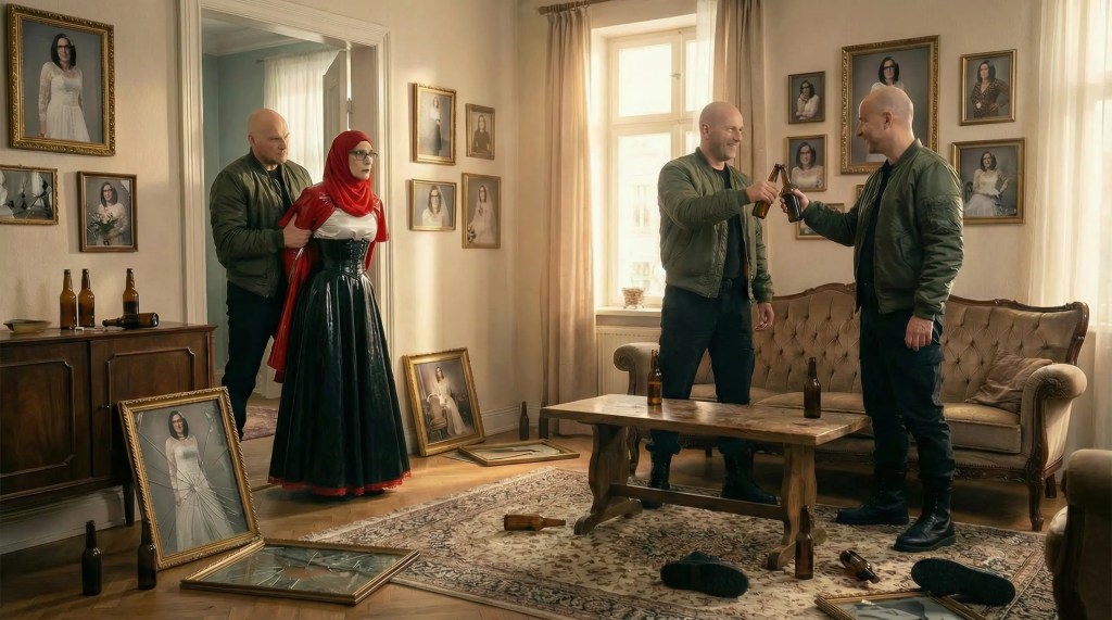 Dann brachte er Rotkäppchen ins Wohnzimmer, wo seine Nazifreunde bereits feierten. Sie prosteten sich zu … und nun würde die Sissy-Schlampe, die Muslima-Sissy erfahren, dass solche Perversionen im wahren Deutschland nicht hingenommen werden könnten.
