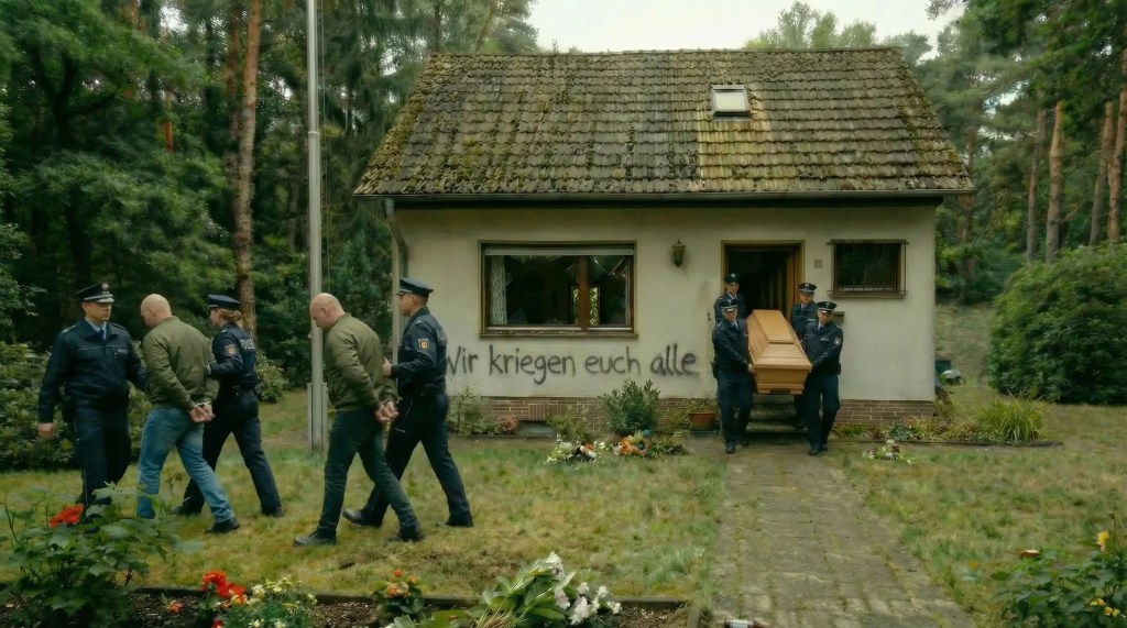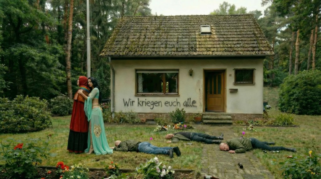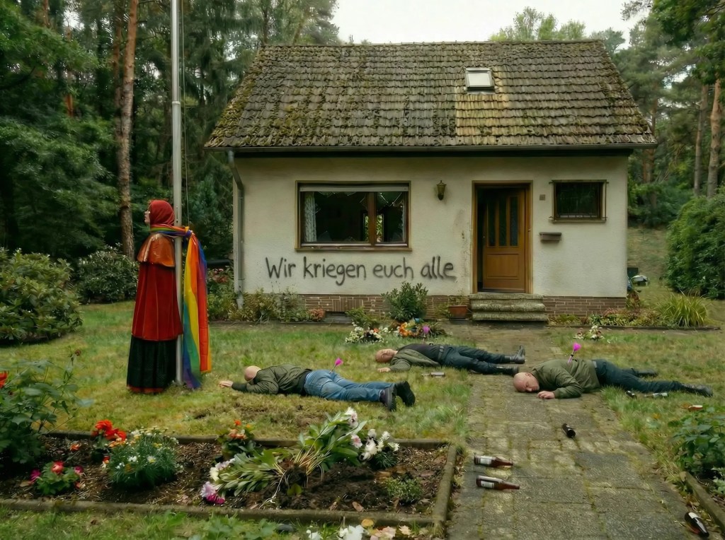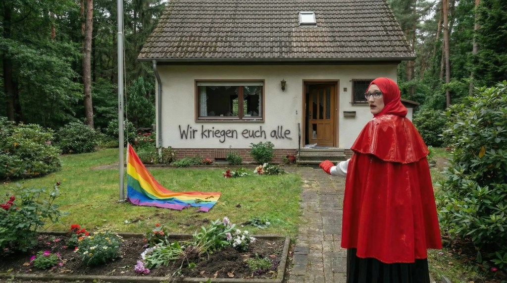 Fanny hatte den Hijab angelegt … sie wusste, dass ihre Großmutter es verstehen würde, doch als sie den Garten betrat, wusste sie, dass Wolf die Großmutter vor ihr gefunden hatte. Die Regenbogenfahne war runtergerissen und zertrampelt worden. Die Hauswand mit einer Hassbotschaft beschmiert. Fenster und Türen waren eingeschlagen und eingetreten worden. Der blanke Hass hatte gewütet, so dass Rotkäppchen angsterfüllt zur Tür ging und mit dem Schlimmsten rechnete. Sie betrat zögerlich das Haus und ging ins Schlafzimmer der Großmutter, dessen Tür offen stand. Rotkäppchen wusste, dass Wolf im Haus war.