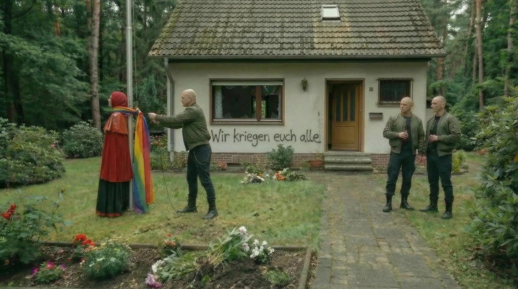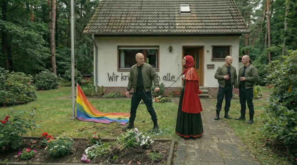 „Ausgerottet gehört ihr“. Seine Kumpel prosteten Wolf zu. Er fesselte Rotkäppchen mit der Regenbogenfahne am Mast, so dass ihr die Luft knapp wurde. Er würde sie an der Regenbogenfahne den Mast hochziehen und zusehen, wie sie daran verendete.