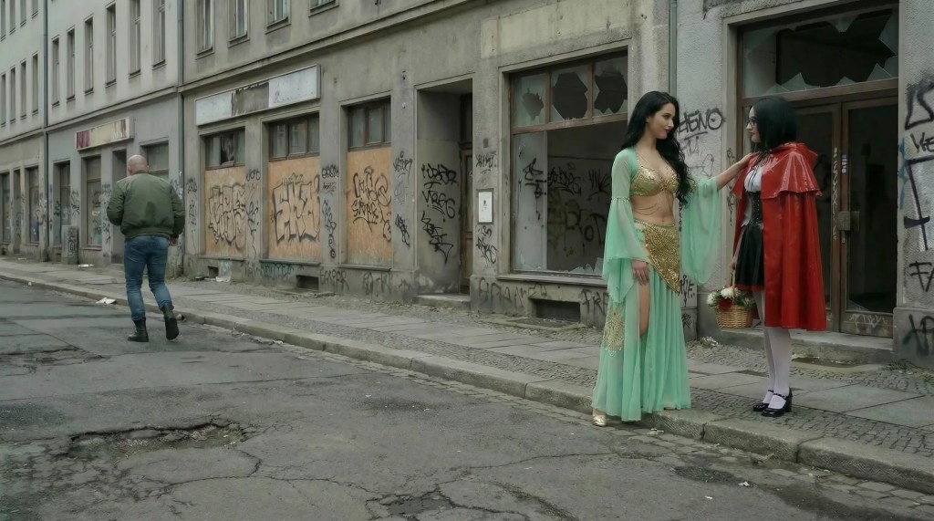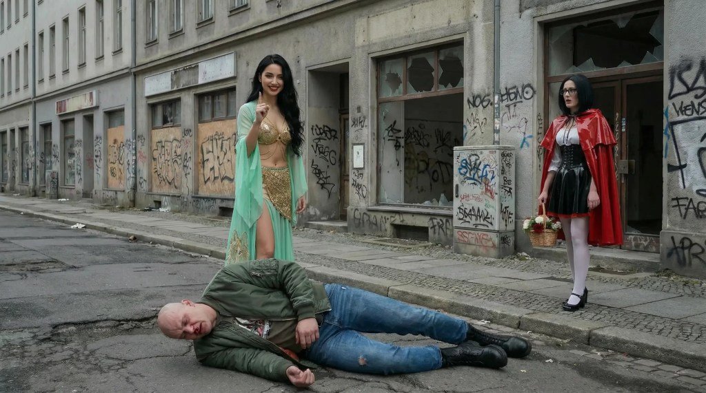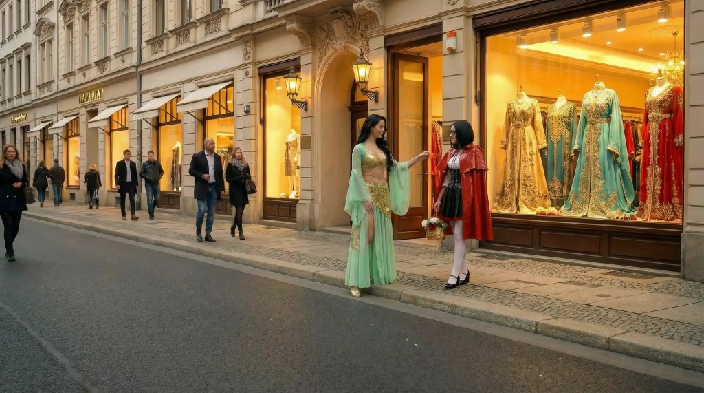 „Lass mich dir eine bessere Welt zeigen nach dem Schrecken“. Und während sie durch die Straßen gingen berichtete Sayyadah dem Rotkäppchen von ihrer Welt, in der auch einer Sissy Respekt entgegengebracht würde, wenn sie der Jägerin eine gehorsame Dienerin werden würde. Es war ein Umweg, aber er würde dem Rotkäppchen gut tun, diesen Schrecken zu verarbeiten.
