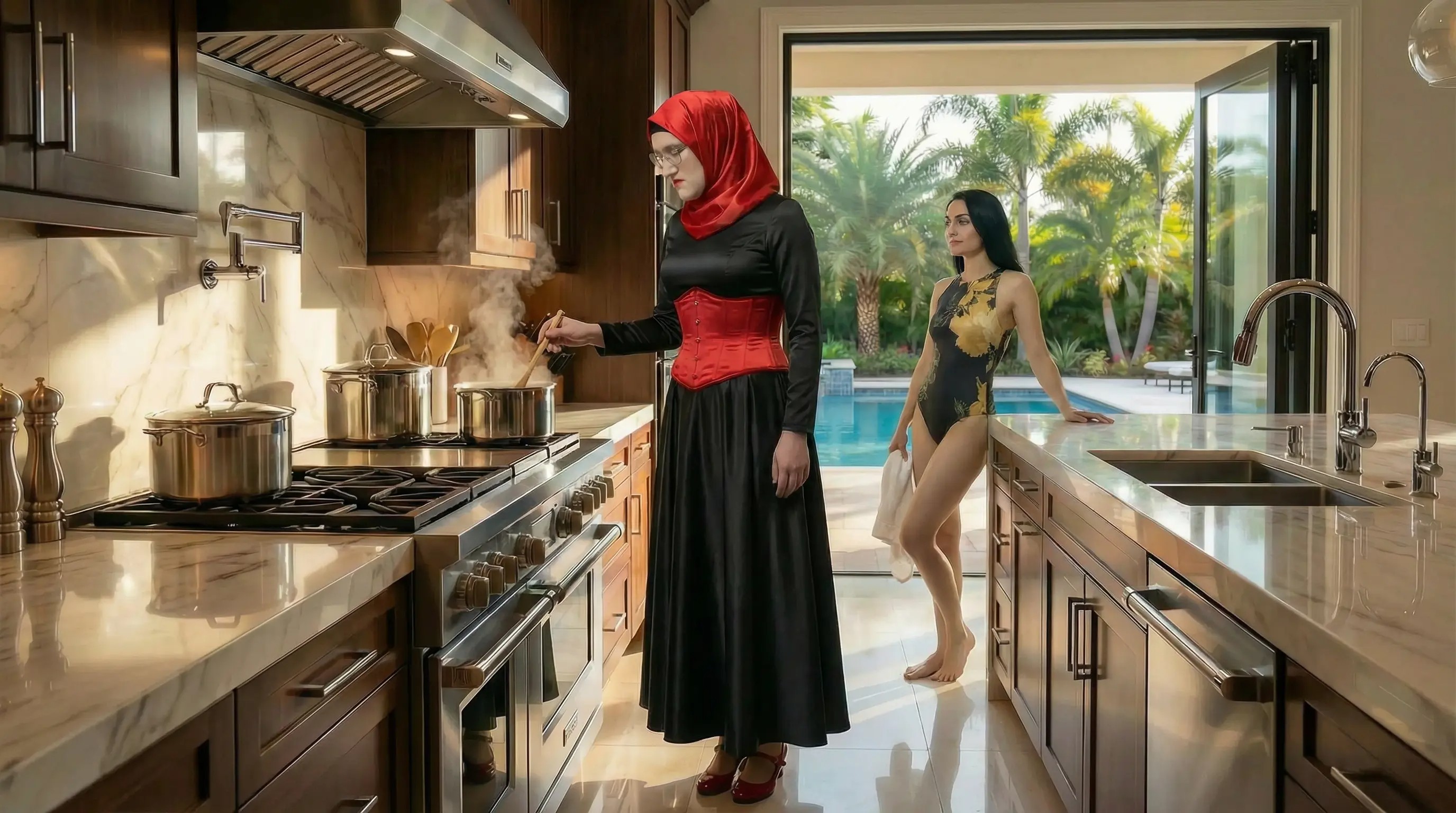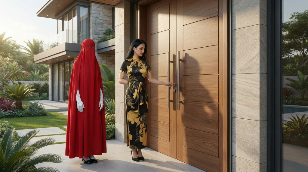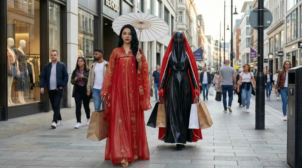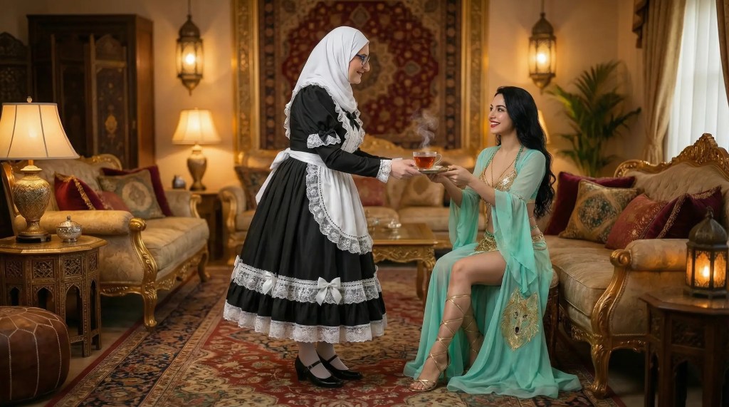 Per Taxi fuhren Rotkäppchen und die Herrin zur Sayyadahs Residenz, wo sie ihre Sissy einließ. Sie selbst hatte den Hijab abgenommen, aber ihre Sissy würde stets einen Hijab und sogar eine Burqua tragen, wenn Männer zu Besuch waren …