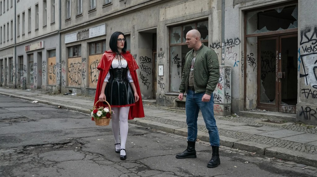 „Ich will schon alles gut machen“, sagte Rotkäppchen zur Mutter und gab ihr die Hand darauf. Die Großmutter aber wohnte draußen am Waldrand, eine knappe Stunde von schäbigen Plattenbausiedlung entfernt, in dem Fanny wohnte. Als Rotkäppchen nun durch die Straßen ging, begegnete ihr der Wolf, ein bekannter Schläger und Nazi. Rotkäppchen kann ihn und wollte ihm aus dem Weg gehen, doch Wolf ließ sie nicht passieren.