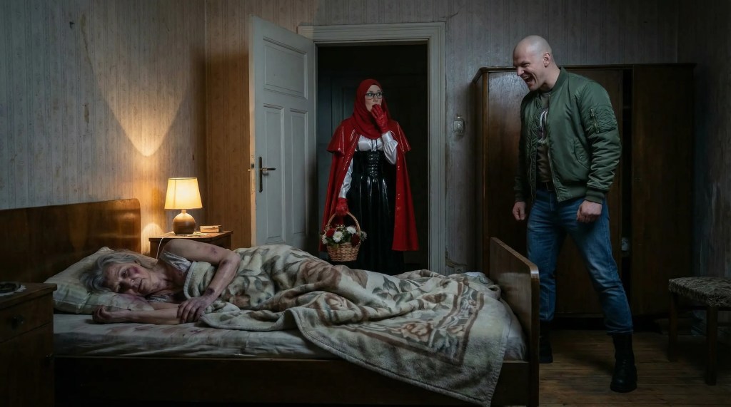 Als Rotkäppchen das Schlafzimmer betrat, lag die Großmutter erschlagen in ihrem Bett. Wolf stand lachend vor dem Bett … ach, hätte sie ihm doch nicht verraten, wo die Großmutter wohnte.
