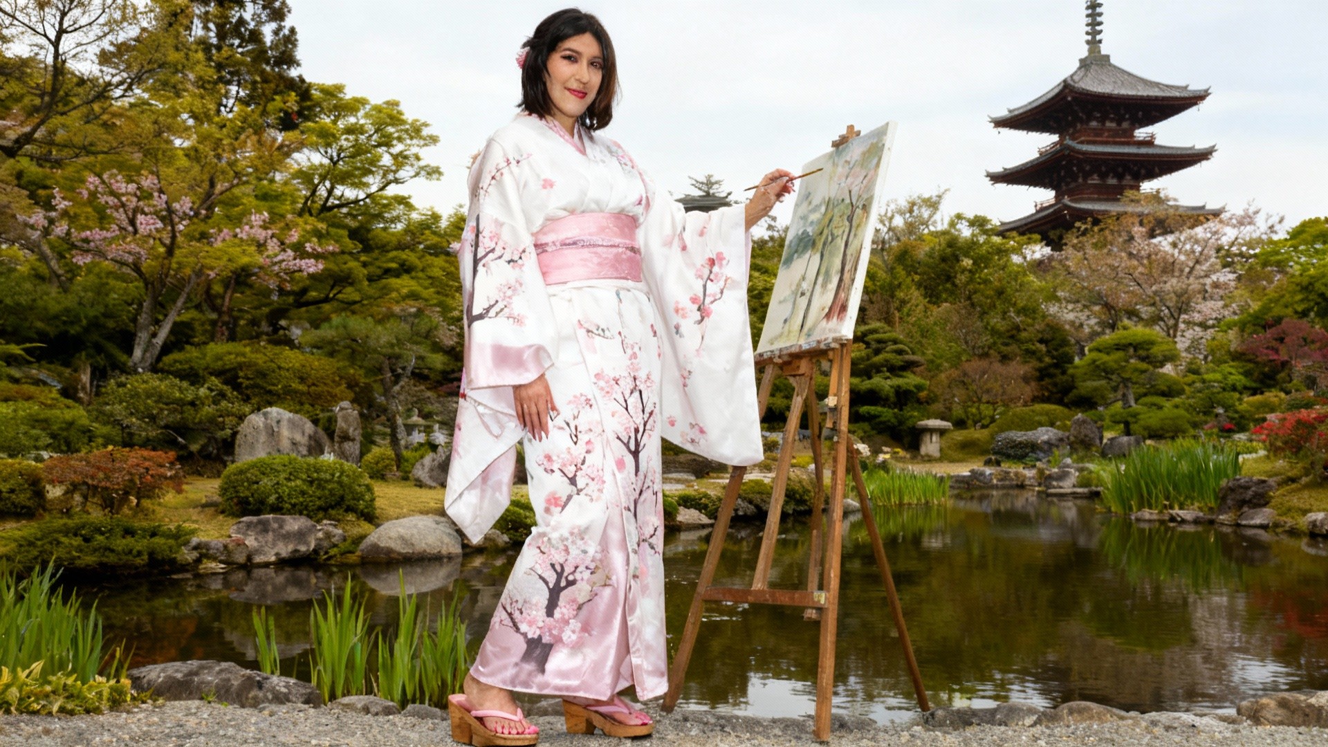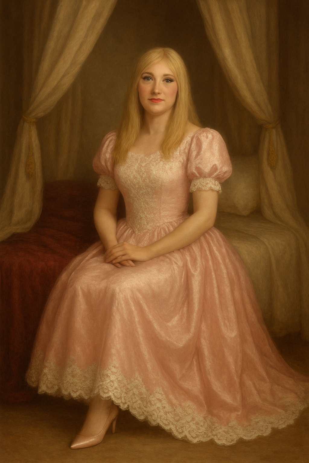 Fanny einmal als Gemälde in einem zartrosa Kleid, und rechts das Referenzbild, das mich real zeigt. Gefällt es dir ?